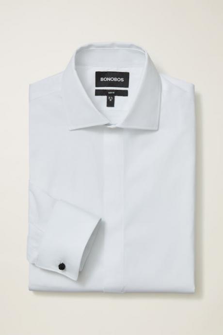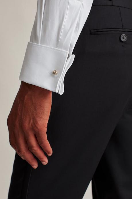 Mother-of-pearl buttons | Split-back yoke | Double-knife pleats | Concealed placket | French cuffs